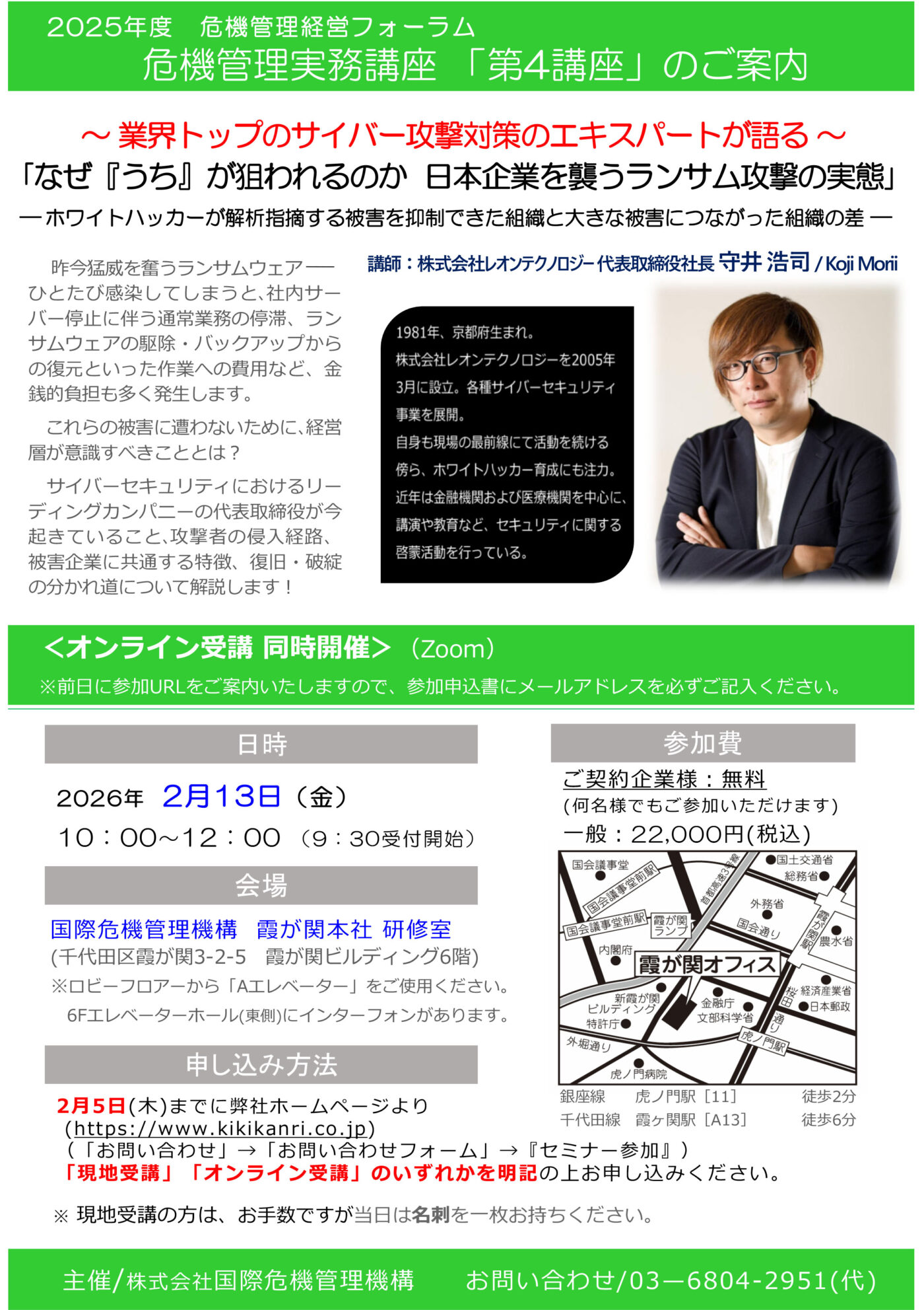 セミナー2026年1月20日 2025年度 危機管理経営フォーラム 危機管理実務講座「第4講座」のご案内 2月13日(金) 第4講座を下記の内容で開催いたします。 参加申し込みは、問い合わせからお申込みください。 < 前の記事